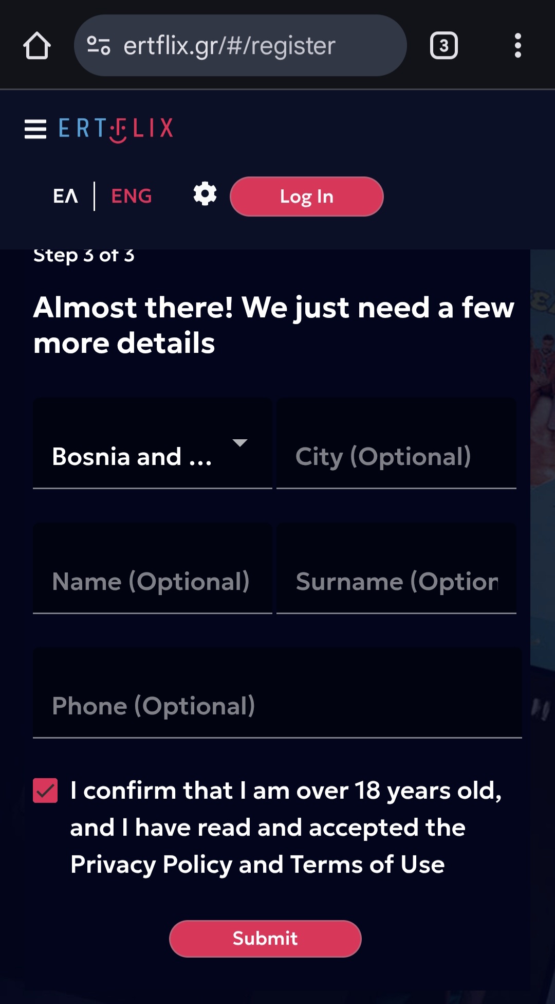 - Follow the relatively classic account creation instructions, don't forget to check your Spam folder in your mailbox for the one-time code ("OTP verification"), enter whichever country of your liking (don't bother setting Greece, geoblocking will block you out of most streams anyway), and you're in!